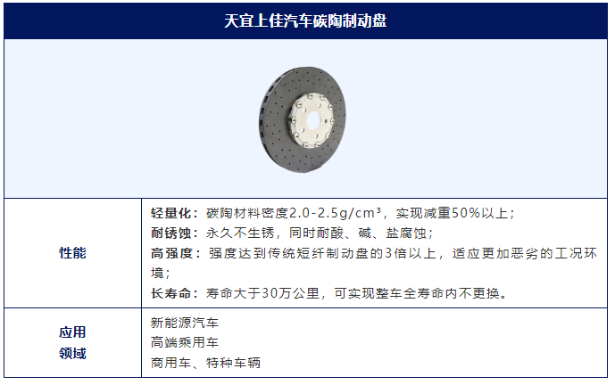 近年来,汽车行业呈现数字化、智能化、电动化的发展趋势,制动系统关键零部件轻量、安全、耐用的市场需求,天宜上佳作为汽车碳陶制动盘产业化应用的积极推动者,将新材料与汽车制动紧密结合,致力于打造具有前瞻性的新材料制动产品。